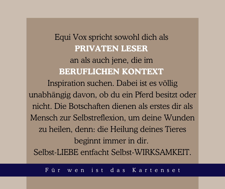 „Equi Vox“ spricht sowohl den privaten Leser an als auch jene, die im beruflichen Kontext Inspiration suchen. Tauche ein in die Welt der Pferde und entdecke die Kraft der Selbstreflexion, Selbstliebe und deiner Selbstwirksamkeit.